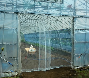 「防蝶ネット」の設置です。 もちろん鳥も防ぎますが、今回のは蝶々のハウス内侵入を防ぐ9ミリ角目のネットです。 ネットの設置は、ハウス入口なので通常のネット張りとはちょっと異なります。 ベタッと固定できないので、それなりの工夫も必要です。 今…