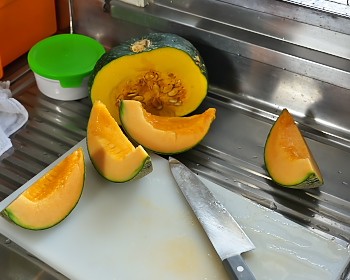 朝食後に、台所の流しで水を飲みながら、ふと見ると切ったカボチャが。 その時は一見して「全部カボチャ」と認識したが、コップを戻す時、なんかいい匂いが・・・ 「ん・・・この匂いは?メロン?」 そうです、メロンです。 先ほどのカボチャをよ~く見る…