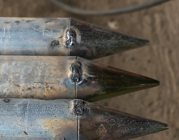 プチ溶接です。 いやプチというよりポチかな。 何の事かというと、菊の花のネット固定など、畑作の色んな場所で、単管(足場パイプという人もいる)を使った杭や支柱などの事ですが、地面に打ち込みする時、先端に尖がった部品を着けて打ち込むと思います…