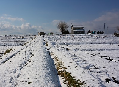 毎年、4月の第一日曜日は改良区の地区水路清掃日。 水路の泥上げなどを行うわけですが、昨夜の雪であたりは真っ白。 積雪は3センチくらいでしょうか、昼には解けてしまいましたが、寒い一日でした。 この日に雪景色となったのは記憶にありません。