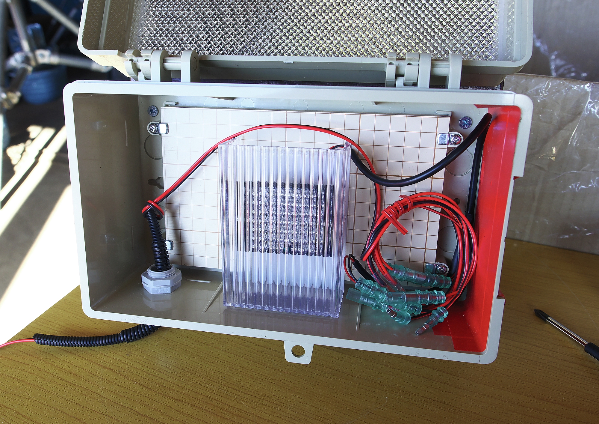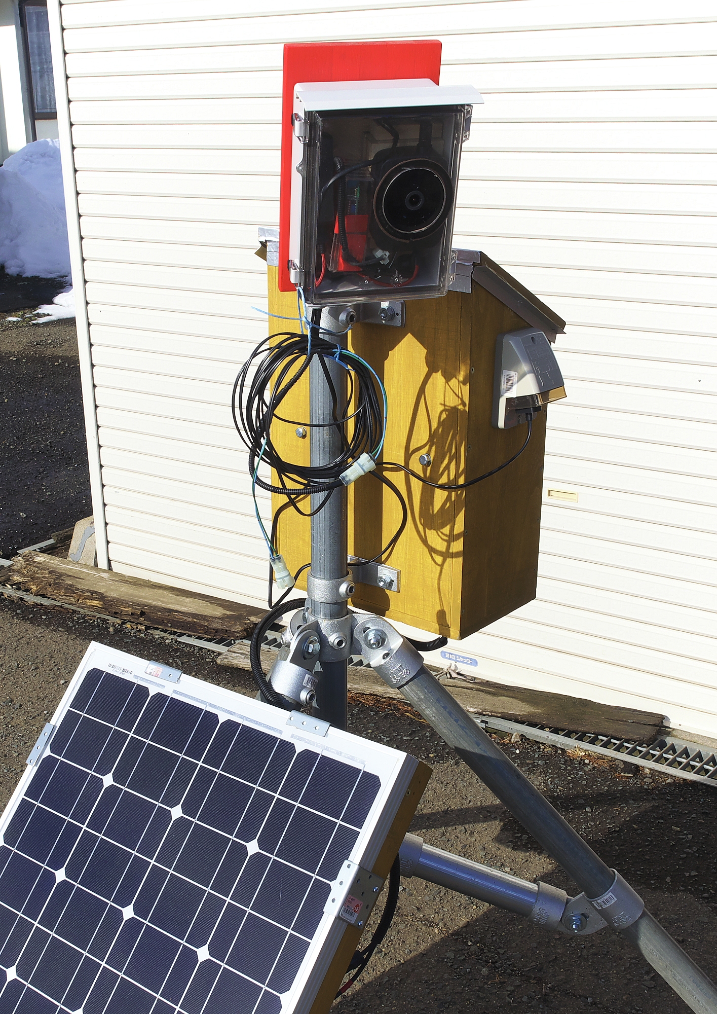 構想していた有害鳥獣駆除システムがほぼ完成した。 ネットワークカメラやリレー付VOX、ACアダプターなどはウォルボックスにまとめた。 扉が透明なので中のゴチャゴチャが丸見え!。 透明にしなきゃ良かったと反省している。 なお、出ているコードはAC1…
